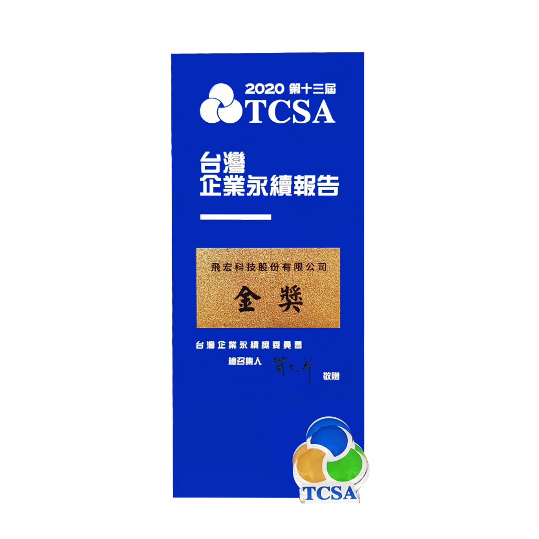 恭賀~飛宏科技再次榮獲「2020年度第十三屆TCSA台灣企業永續獎金獎」肯定 !